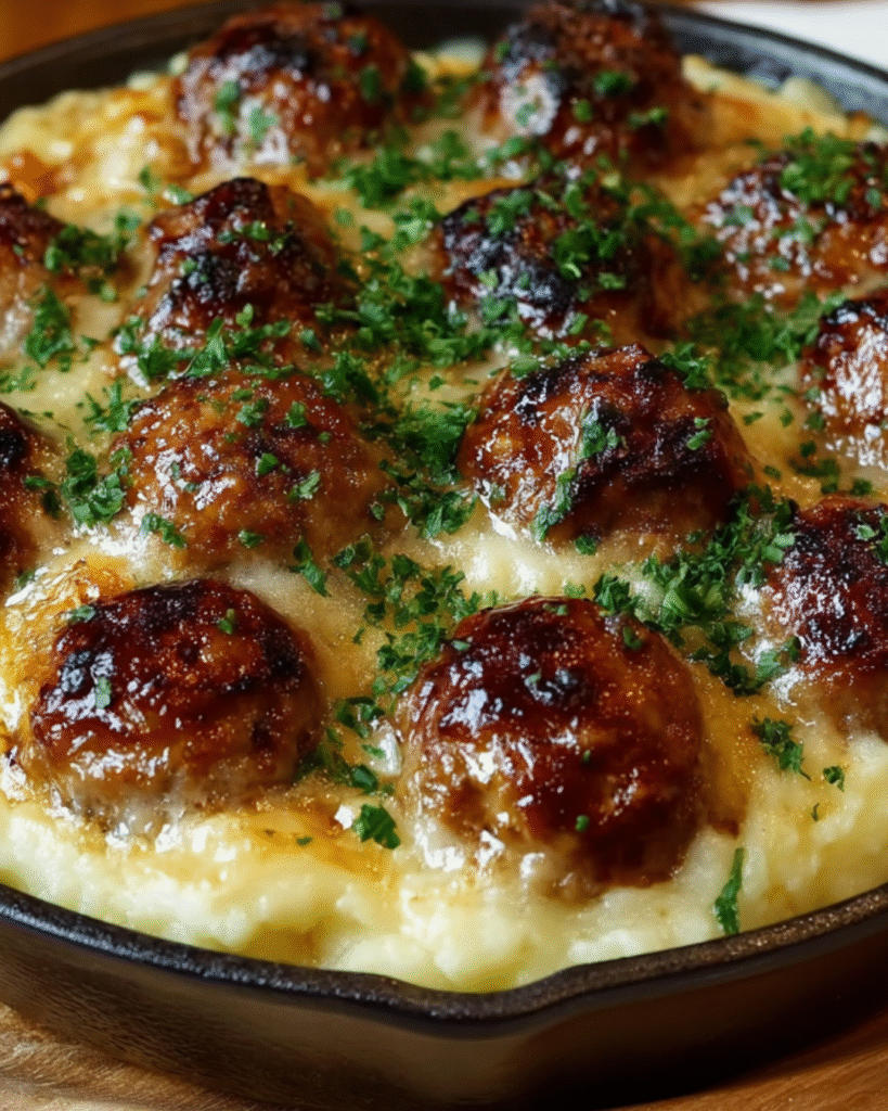 This meatball and mashed potato bake transforms classic Italian-American flavors into a comforting casserole by