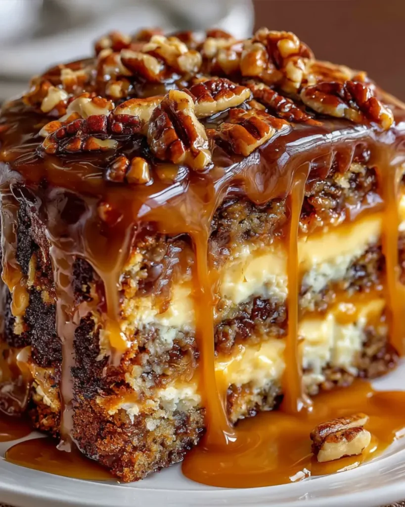 The Turtle Caramel Cake is a masterclass in rustic elegance. It proves that you don’t need piping bags or fondant to create a show-stopping dessert. With its deep chocolate base and the classic, irresistible trio of caramel, pecans, and chocolate chips, it is a crowd-pleaser that delivers comfort and luxury in equal measure. Whether for a holiday table or a Tuesday treat, this cake is pure indulgence.